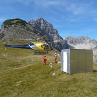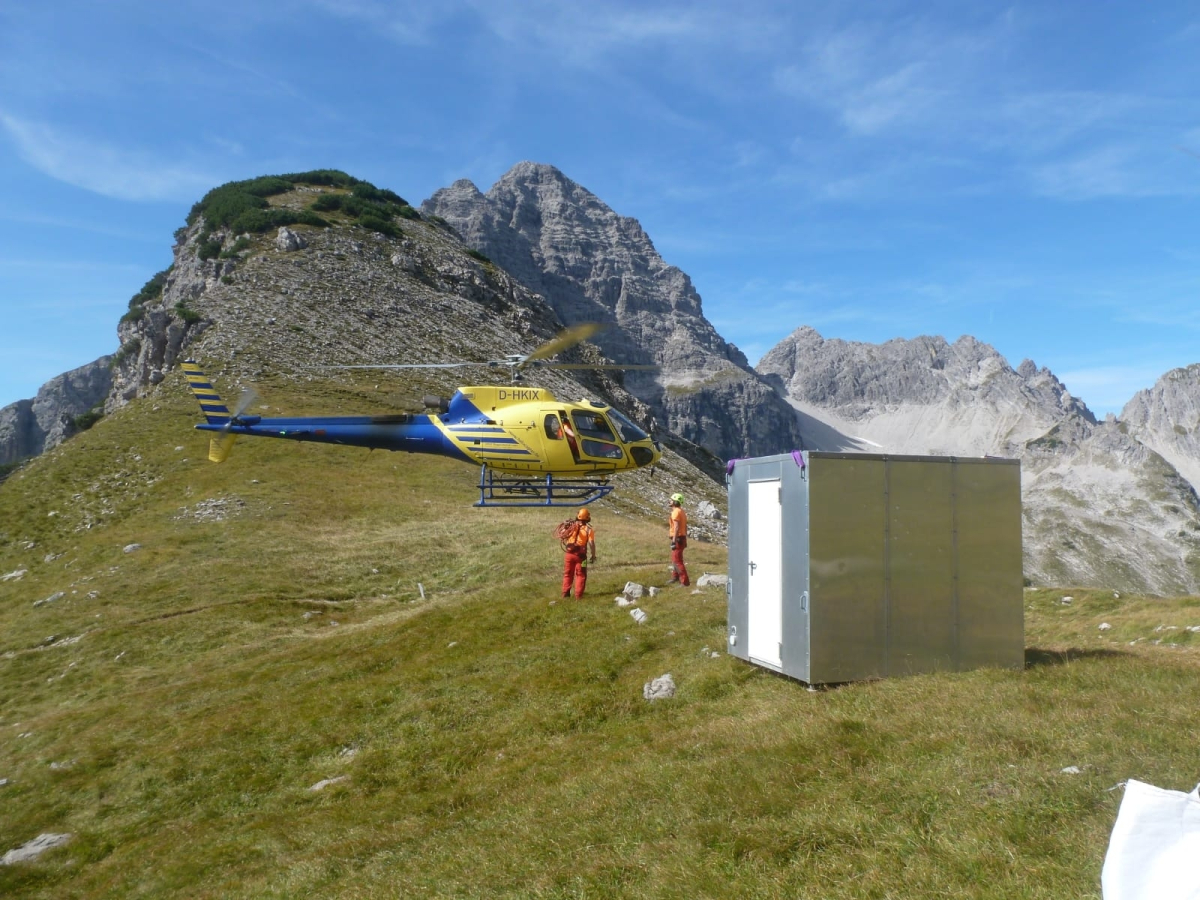 Kommt eine Hütte geflogen... Wenn unsere Jungs vom Wegebautrupp die Baustellen für den Grenzgänger einrichten, dann ist oft auch das "Mobile Home" für die Wegebauer dabei - ein Materialcontainer, der als Lager, Notunterstand und mobile Werkstatt dient. Während des Sommers stand die Hütte im Bereich Notländ, aktuell wird sie für den Einsatz unterhalb des Hochvogels am Fuchsensattel genutzt.